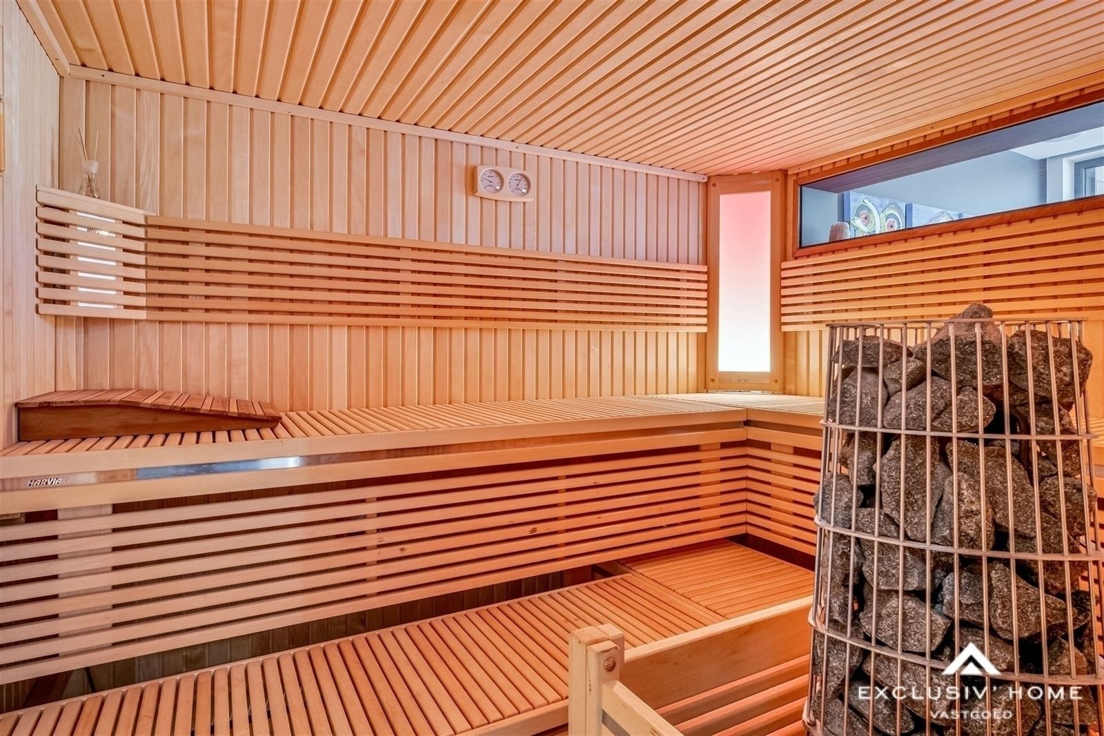 • First floor: an inviting entrance hall leads to a guest toilet with cloakroom, a spacious and bright living room with fireplace, dining area, and a luxurious open kitchen equipped with high-end appliances. Additionally, there is a utility room, an office, and a wellness area with sauna and a separate toilet.